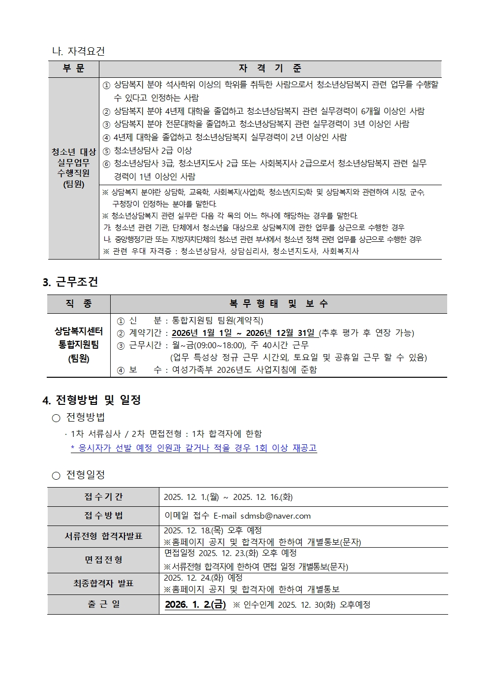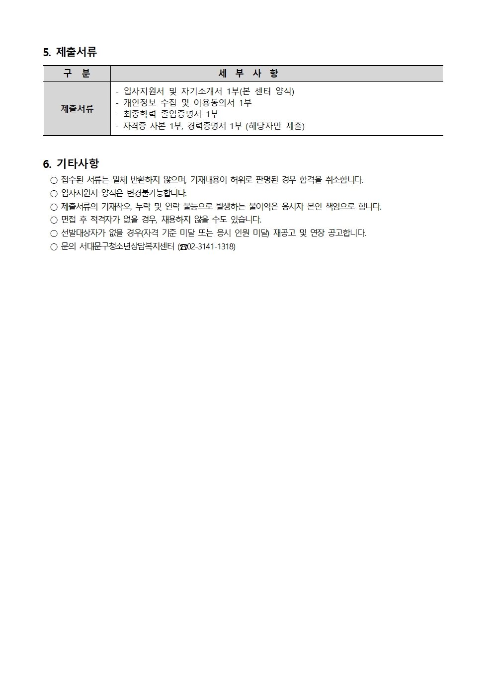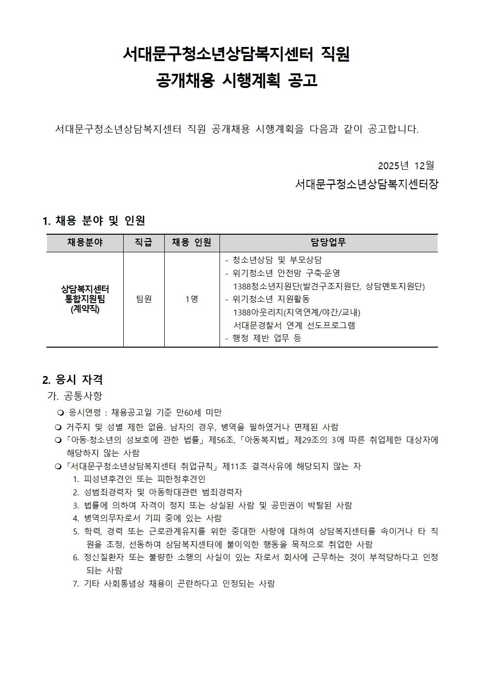 2025년 서대문구청소년상담복지센터 직원(통합지원팀 팀원) 공개채용 공고