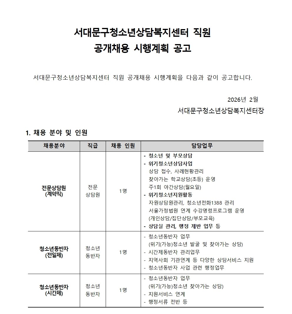 2026년 서대문구청소년상담복지센터 직원 (전문상담원, 청소년동반자 전일제/시간제) 공개채용 공고
