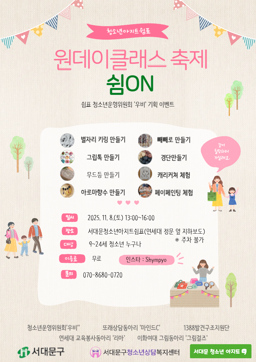 서대문청소년아지트 쉼표에서는 11월 8일(토) 모든 청소년을 대상으로 원데이클래스 축제 '쉼ON'을 진행합니다!